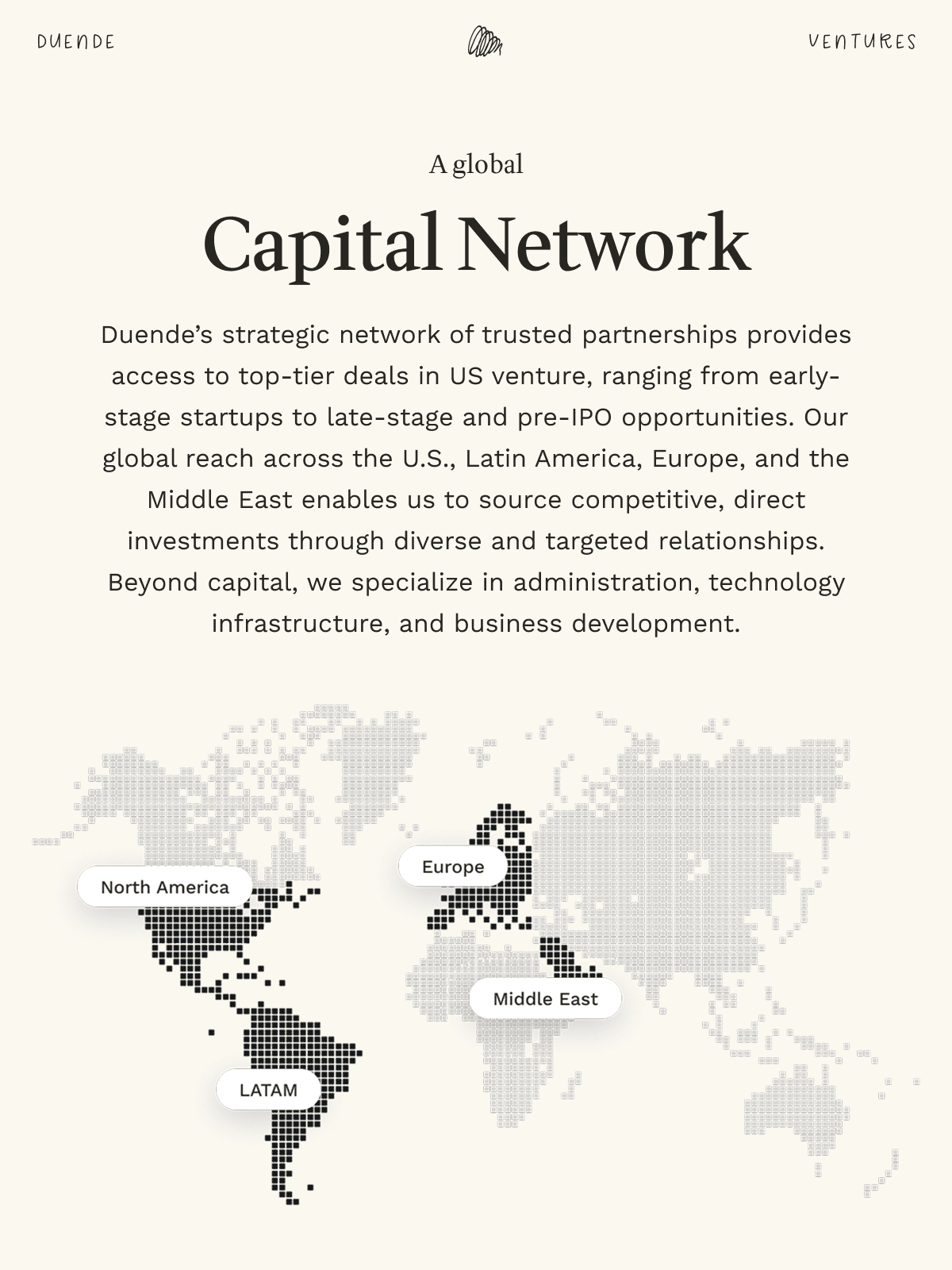 Duende Ventures connects international capital allocators to exclusive investment opportunities in the US Venture market.